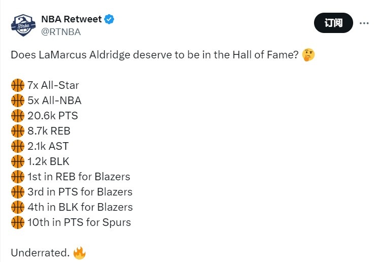 8月23日讯 今天,美媒NBA Retweet晒出了阿尔德里奇职业生涯的数据和荣誉,并在旁边发问:“阿尔德里奇是否值得入选名人堂?”NBA Retweet列出的数据以及荣誉为:7次全明星5次最佳阵容20600分8700篮板2100助攻1200盖帽开拓者队史篮板王开拓者队史得分榜第3开拓者队...